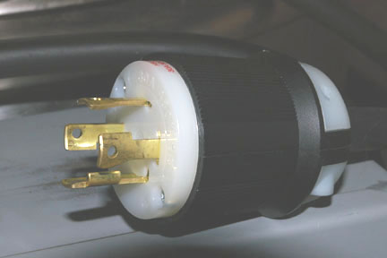 View of the power cord plug. Cord is 8 feet, for 3 phase 220/240 volt power source.